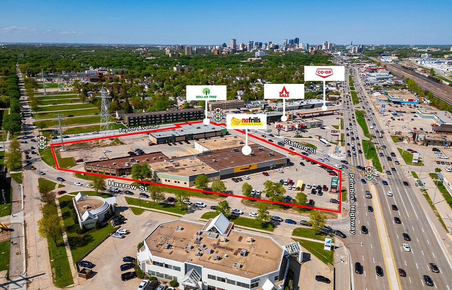 Grocery-Anchored Centre at High Traffic Intersection This grocery-anchored site has frontage on Pembina Highway, Stafford Street, and Harrow Street. Tenants include a recently renovated No Frills and a newer Dollar Tree. The property features three access points from major thoroughfares, ample parking, and pylon signage. Located on the southwest corner of Pembina Highway and Stafford Street, this property sits on a major north-south thoroughfare. The site is at the junction of four arteries with controlled intersections at Pembina & Stafford, Stafford & Taylor, and Harrow & Taylor. Several transit stops and the Blue Line Rapid Transitway are nearby. The centre serves the Tuxedo, River Heights, Fort Rouge, and Fort Garry neighbourhoods and is near new multi-family residential developments on Taylor Avenue.