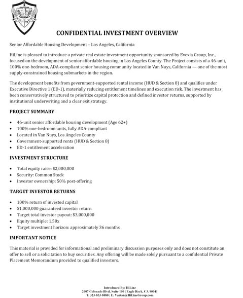 Full underwriting materials and the Private Placement Memorandum (PPM) are available upon request to qualified parties. ( Email Vartan@HiLineGroup.com or Call 323-833-8888 )