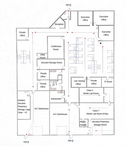 TOTAL SIZE: ±11,812 SF - Warehouse: ±3,100 SF • Air-Conditioned warehouse • 19’ Clear • Isolated Secured Pharma Storage - Office: ±7,000 SF • 8 Total Offices Rooms with 3 Executive Offices • 2 large open floor plans for bullpens • 1 Kitchenette/Break Room • 1 Secured Locker Room • 1 Conference Room • Turn-key Plug ‘n Play with Furniture Available - Clean Room Space: ±1,000 SF • Class 7 (Prep): ±500 SF • Class 5 (Sterile): ±500 SF • Bio Freezer: 630 Cubic SF - Secured Pharmacy Storage: ±987 SF • Dry: 462 SF, Clear: 9’ • Dry Isolated (w/stacking): 525 SF, Clear: 19’