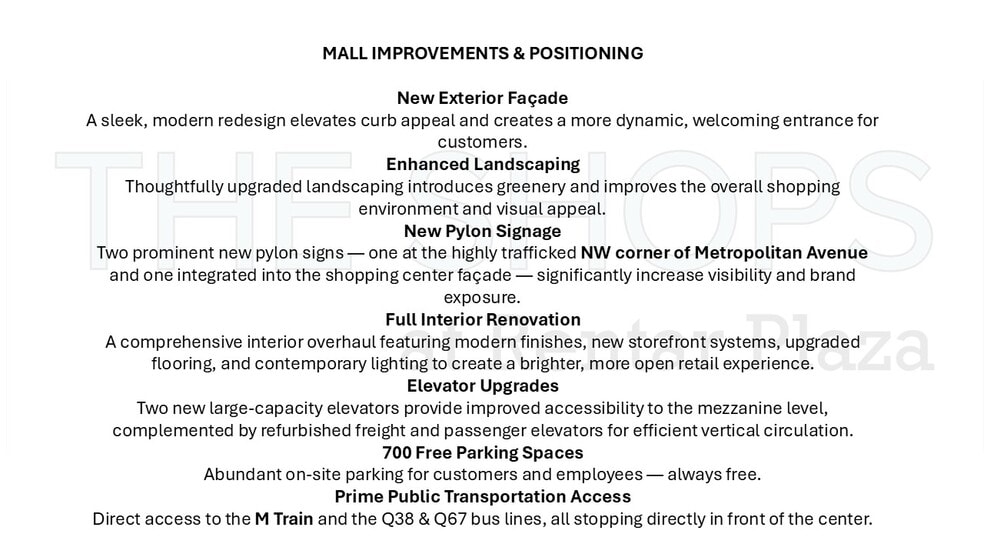 New Exterior Façade: A sleek and modern design that improves curb appeal and creates a more welcoming entrance. Landscaping Improvements: Thoughtful landscaping enhances the overall atmosphere and creates a greener, more attractive environment. New Pylon Signs: Two large new pylon signs—one at the NW corner of Metropolitan Ave. and one on the shopping center façade—will increase visibility and attract more foot traffic. Interior Overhaul: A complete renovation of the interior space that will feature modern finishes and a more open layout with new storefronts, floors and lighting. Elevator Upgrades: Two large-capacity elevators are being installed to improve accessibility, alongside the refurbishment of existing freight and pedestrian elevators for faster and easier access to the mezzanine level. 700 Spot Free Parking Lot: Ample parking for both customers and employees, with no charge to park. Prime Public Transportation Access: Convenient access to the M-train and two major bus lines that stop directly in front of the shopping center. Rentar Plaza, located in Middle Village, Queens, is a flourishing, innovative 1,567,208 sq ft facility, with 325,000 sq.ft. of shopping space. Each of its three 11 acre levels has it's own truck docks, automobile access and mechanical systems. Since it's conception, it has been continuously evolving and improving. Rentar Plaza was built by Rentar and is still owned and managed by Rentar today.