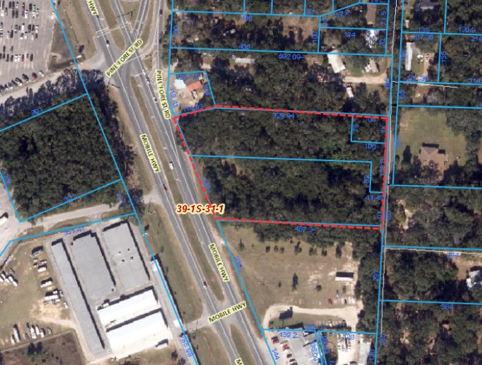 This flat, wooded lot with excellent visibility and great access features 310 ft frontage on Mobile HWY consisting of 3.61 acres.