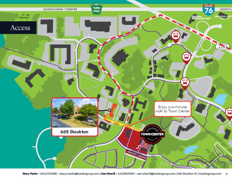 Eagleview is a live work play community, consisting of 800 acres, located on Route 100 at the Downingtown Interchange (Exit 312) of the PA Turnpike. Eagleview provides the highest quality office, R & D, manufacturing, retail and residential accommodations to over 10,000 people. 665 Stockton is located one block from Eagleview Town Center amenities; On-site amenities: The Brickside Grille, Suburban Beer Garden, Al Pastor Mexican Restaurant, Bluefin Sushi, Gemini Hair Design & Spa, Wellington Square Book Shop, Persis Indian Grill, Rita's Water Ice, Good Life Organic Kitchen, Twin Valley Coffee, Good Girls Bakery and acac Fitness Center are located at the Town Center. Ideally situated on Route 100 at the Downingtown Interchange (Exit 312) of the PA Turnpike.