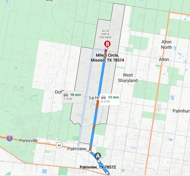 into a 2-lane. Prime 10 ACRE site, excellent for commercial use, multi-family or single family development, restaurant, medical, retail development, warehouse/storage, etc. Site is located between Mile 5 and Mile 6, area of new growth to the north of City of Palmview. Located just north of I-69 (Expwy 83) about 13 miles to the site. New businesses directly across from the site and residential to the north.