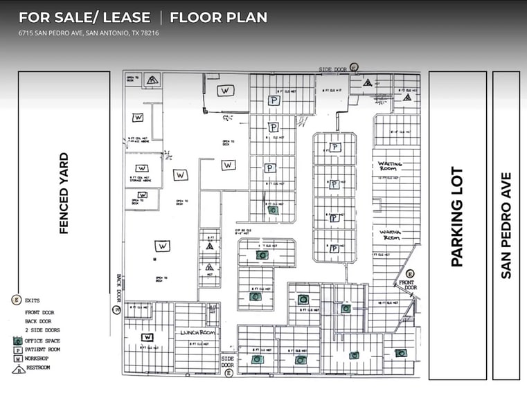 6715 San Pedro Ave, San Antonio, TX – versatile medical office/flex/retail building with excellent visibility and signage at the corner of San Pedro Ave and Veda Mae Dr, just south of Oblate. The property includes a small fenced yard, grade-level door (currently enclosed), and C-3 zoning that allows a wide range of uses including medical, office, retail, and automotive.