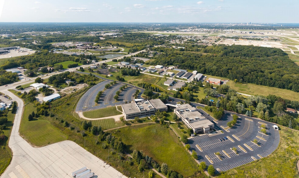 The property features top-tier amenities including a modern auditorium, a large common tenant lounge and cafeteria, a shared kitchen area, and abundant surface parking with over 850 spaces and 6.9/1,000 ratio. Its location just 10 miles from downtown Milwaukee and only minutes from Milwaukee Mitchell International Airport provides unmatched convenience for employees and visitors alike.