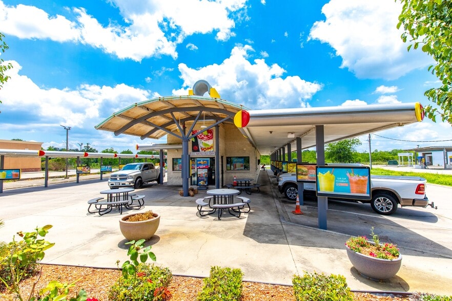 REDUCED! Former Sonic Drive In Restaurant Facility 22 Covered Drive up stalls 15 Parking spaces Vent hood in place Cooler/Freezer in Place Restrooms - 2 (1-Interior and 1-Exterior) Grease Trap Signage Stock Shelving/ Prep Equipment 3 Compartment Sink Retail Counters POS System (partial) Outdoor Dining Area Tenant pays Water/Sewer/Electric “Move in Ready” Interior