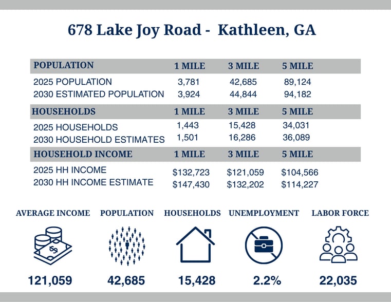 This ±3,000 SF retail space at 678 Lake Joy Road in Kathleen, GA offers a strong opportunity in one of Houston County’s growing commercial corridors. Situated on approximately 1.05 acres, the property features ample parking and a flexible layout, previously occupied by Brown’s Eye Center. Located at the signalized intersection of Lake Joy Road and Highway 96, the site provides excellent visibility with a combined traffic count of over 36,000 vehicles per day. The surrounding area includes well-known retailers and restaurants such as Firehouse Subs and Freddy’s Frozen Custard & Steakburgers, along with nearby destinations like Lowe’s, Rigby’s Entertainment Complex, and Houston Lake Cinemas. Offered at $30/SF, NNN, this space benefits from strong local demographics, steady residential growth, and a high-traffic retail environment.