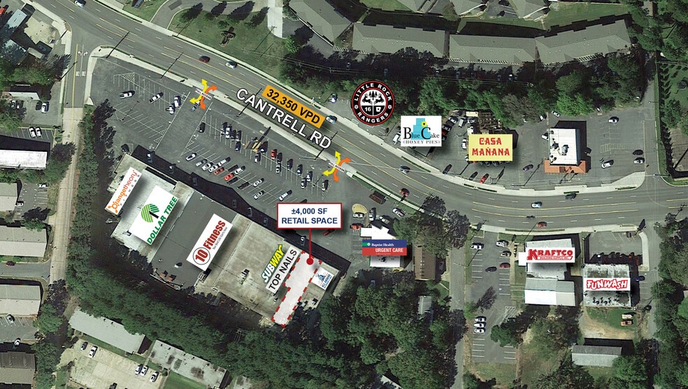 • Excellent location with prime frontage on Cantrell Rd • Positioned on a primary, signalized east-west corridor • Dense, affluent demographics • Near major medical hubs, including UAMS and St. Vincent’s Hospital • Strong co-tenant mix: Orange Theory, 10 Fitness, Dollar Tree, Baptist Health Urgent Care • Recent leasing momentum: Two new tenants signed within the past year (10 Fitness, Dollar Tree) • Flexible use potential: ideal for retail, office, service, or mixed-use redevelopment (subject to zoning/approvals)