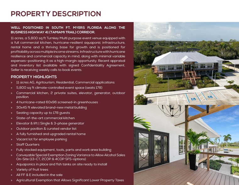 Recent Appraisal $8,000,000. Along the highly traveled US Highway 41/S Tamiami Trail corridor in South Fort Myers, Florida, this 11-acre agritourism property offers a profitable mixed-use investment opportunity. Featuring a 5,800-square-foot turnkey multipurpose event venue, the property comes with a full commercial kitchen, hurricane-resilient aquaponic infrastructure, and an on-site rental home. Set within a thriving commercial area, providing strong visibility and accessibility for guests and business operations. With minimal variable expenses and commercial-grade infrastructure, this property is structured for high-margin performance and sustainable growth. Seller is getting weekly calls to book personal and corporate events.