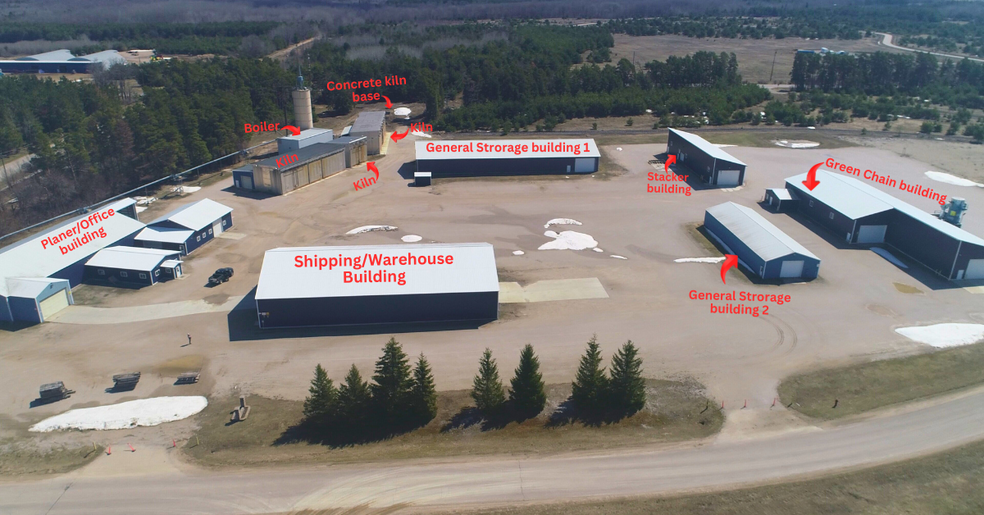 The former Northern Hardwoods facility in Newberry, MI is now available for purchase! Most recently operated as a concentration yard, this is a facility that purchases green lumber from sawmills, dries it in kilns, and then planes, grades, and resells it as kiln-dried (KD) lumber. This expansive operation is located in an industrial park just outside of Newberry in Luce County. The property consists of just under 29 acres with multiple access points. The land is level and much of it cleared and graveled. The total building square footage is approximately 60,000 with about 1500 square feet of office space, and the balance being varied manufacturing and storage space. There is an industrial sized boiler with a biomass system that would convert saw dust by-product into steam to operate the kilns. Six other large buildings are located onsite, as well. Some equipment & machinery remains from the hardwood operation, but could certainly be recycled to re-purpose the spaces. The site is available "as is" with the current equipment intact. A purchaser could re-boot the operation with limited input cost. Detailed specs of the buildings and parcels are available. All but one of the buildings are insulated and heated, and the general condition of the facilities is quite good! The yard space is significant, as well, providing more than 10 acres of additional expansion if desired.