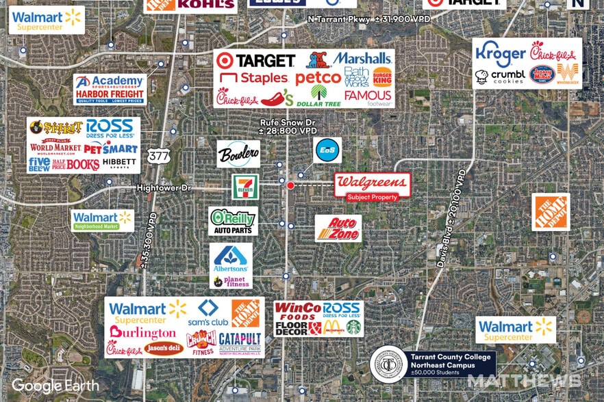 - Excellent Visibility & Traffic Exposure: Positioned on a hard corner at Rufe Snow Drive (±28,800 VPD) and HighTower Drive (±7,000 VPD).
