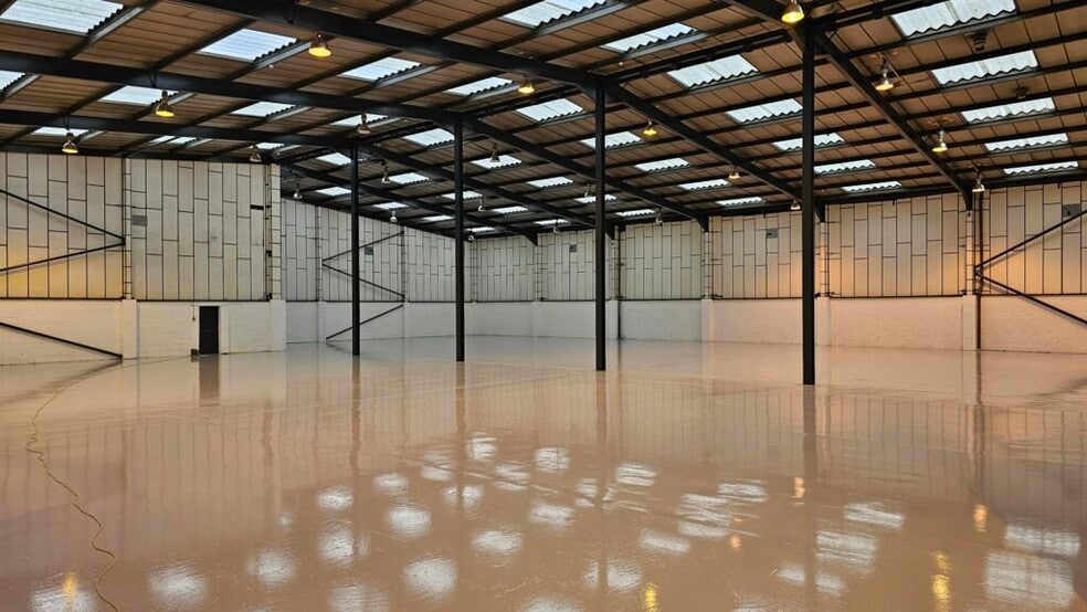 The available unit comprises a large open-plan warehouse with an eaves height of approximately 6.8m and an apex height of 8m, accessed via two new electronic roller shutter doors. The ground floor includes a reception area and office space, with further offices, a meeting room, kitchenette, and WC facilities on the first floor. The secure forecourt provides ample yard space for loading and parking, supporting a wide range of industrial and logistics operations.