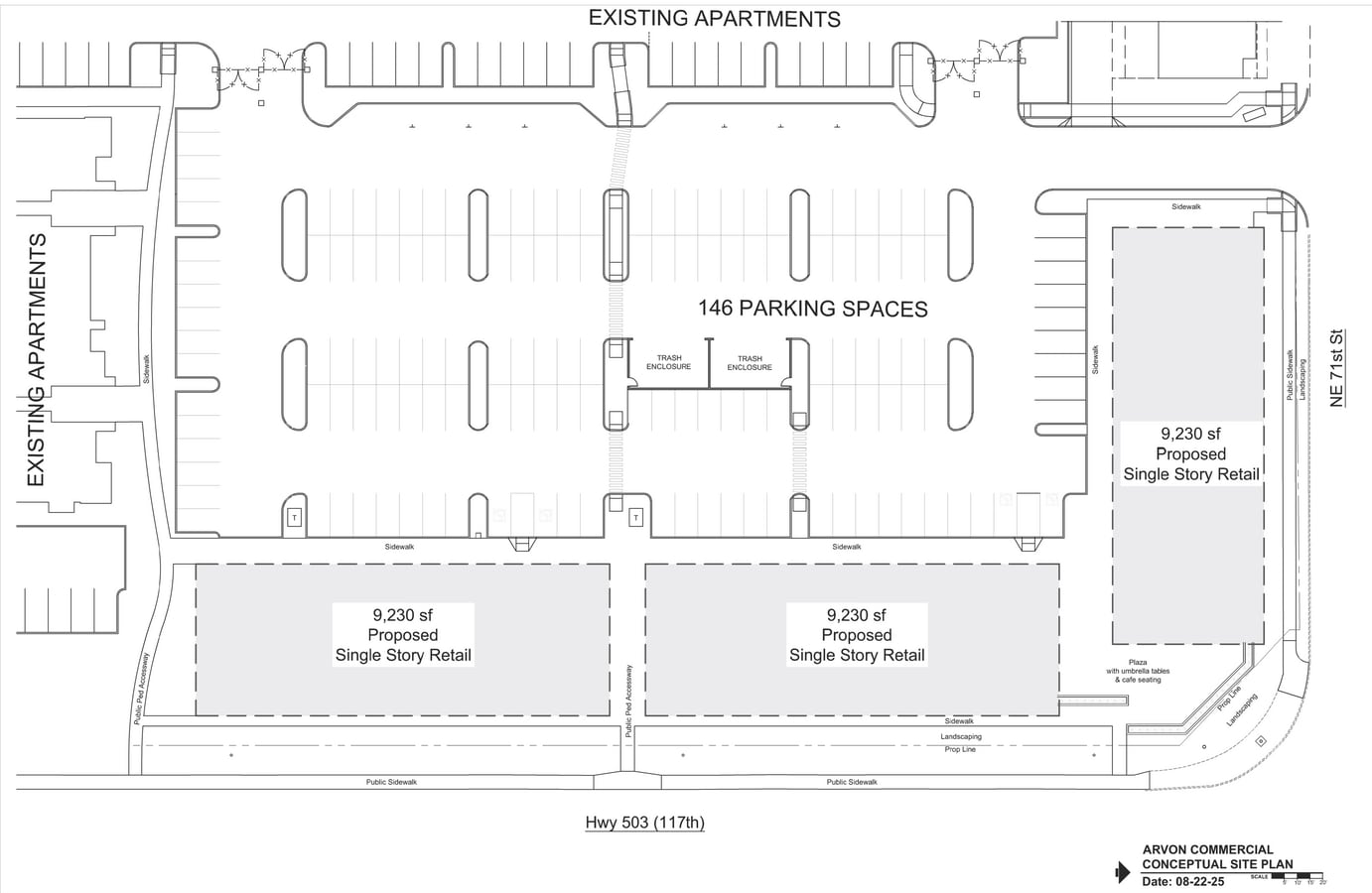 The Arvon Commercial is a planned retail hub located at 7000 NE 117th Avenue in Vancouver, Washington. This 2.59-acre site sits at a signalized intersection in a vibrant trade area, offering exceptional visibility and access from major thoroughfares including Padden Parkway and Highway 503. The property is designed for three new construction retail buildings, each approximately 9,230 square feet, complemented by generous parking and pedestrian-friendly infrastructure. Surrounded by residential density—including 274 apartments and nearby townhomes—the site is positioned to capture both local and commuter traffic. Nearby anchors such as Fred Meyer, Lowe’s, and CarMax reinforce the area’s retail strength, while the surrounding neighborhoods provide a steady consumer base. The conceptual plan includes sidewalks, landscaped public spaces, and café seating areas, creating an inviting environment for shoppers and diners. With strong demographics, high traffic counts, and flexible design options, The Arvon Commercial is ideal for retailers, restaurants, and service providers seeking a premier location in Vancouver’s growth corridor.