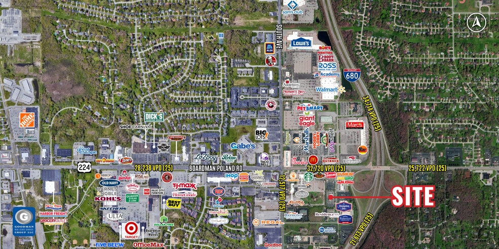 AVAILABLE: 6,220 SF on 1.77 AC for lease Signalized access off of Boardman Poland Road at Tiffany South Located directly off of Interstate 680 in a hotel cluster, providing a built-in customer base High traffic counts in excess of 32,000 vehicles daily Over 100,000 residents with average household incomes of over $75,000 live within a five-mile radius