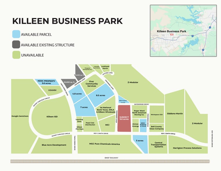 Located in the heart of the Killeen Business Park, this 9.58-acre property falls under an M-1 (Manufacturing Zone), which allows for light to medium industrial or commercial uses. The site has established drainage, electricity, gas and both clean water and wastewater utilities. This parcel has also been rough graded with a drainage channel that runs north/south along east boundary. This property has frontage on Roy J. Smith Dr, which is a collector roadway with an average traffic of approximately 1,325 vehicles per day. The frontage road, Swanner Loop, is a 2-way, 2-lane (1 lane in each direction), asphalt paved, publicly maintained roadway with concrete curbing/gutters. The property is also has additional frontage on Enterprise Drive which is also a 2-way, 2-lane (1 lane in each direction), asphalt paved, publicly-maintained roadway with concrete curbing/gutters and on Roy J Smith Drive which is a 2-way, 4-lane (2 lanes in each direction), asphalt-paved, publicly-maintained road with concrete curbing/gutters and storm sewerage. 702 Swanner Loop is bordered by Atmos Energy offices and the Roger Ward Moving Company to the east, and an MCI call center to the west. Additionally, Z-Modular and Mitsubishi Pure Chemicals America also neighbor this property, which indicates the successful business community that calls the park home. With established infrastructure and triple public road frontage, 702 Swanner Loop is an ideal location for industrial or commercial operations.
