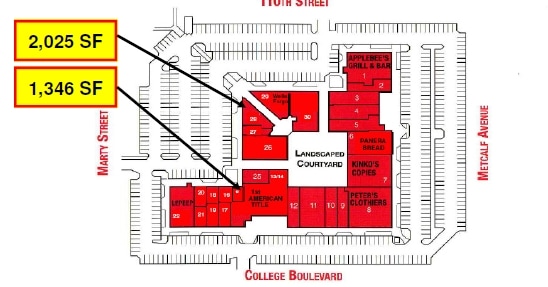 The 2,053-square-foot space can be divided, with 1,033 square feet facing College Boulevard and 1,020 square feet facing north toward 110th Street. A cased opening currently splits the suites. Each side has a private restroom and four private offices.