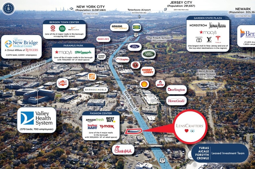 Paramus, New Jersey, located in Bergen County just a few miles from New York City, is one of the highest-grossing retail markets in the United States. Its strategic location near major highways such as the Garden State Parkway and Route 17 ensures accessibility for millions of residents and visitors from both New Jersey and New York. These thoroughfares generate high daily traffic, making Paramus a prime destination for shopping.