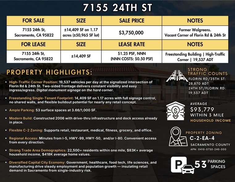 Former Walgreens at the signalized corner of Florin Rd & 24th St. ±14,409 SF freestanding building on 1.17 acres (±50,965 SF lot). Two-sided frontage with 19,537 ADT at the intersection. Built 2006 with drive-thru infrastructure, dock access, and 53 parking spaces (3.66/1,000 SF). C-2 zoning supports retail, restaurant, medical, fitness, grocery, and office uses. Also available for lease at $1.25 PSF NNN.