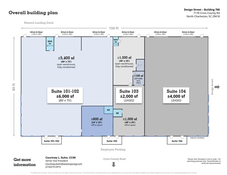 Building 700 (7178 Cross County Rd) offers a unique opportunity to lease prime, move-in ready office-flex space with multiple drive-in doors and access to shared loading docks. Situated on the corner, at the intersection of Design Street and Cross County Rd in the heart of North Charleston with +300ft of frontage on Cross County Rd. one of Charleston’s key commercial corridors – is ideally positioned for a variety of industrial, flex, office, and related users. Built around 2002, Building 700 is a ±12,000 sf (80’ x 150’) multi-tenant Industrial-Flex building on a ±1.14 ac portion of the 35.64-acre master planned Industrial Site. The building was originally designed to be subdivided into increments of 2,000sf (25' x 80') each unit with one 12'w x 14'h grade-level drive-in door. Each space is fully conditioned, and includes signage along the front entry, clear heights of 10' to 24', 31 total parking spaces, drive-in access, plus loading dock access via the common docks located in between Building 700 and Building 100. Contact Avison Young for details and to learn more about the latest availabilities within the Park.