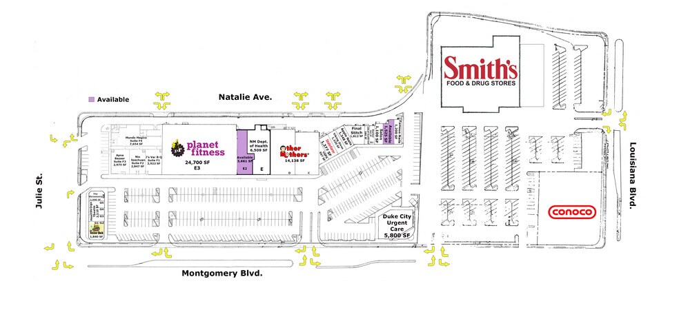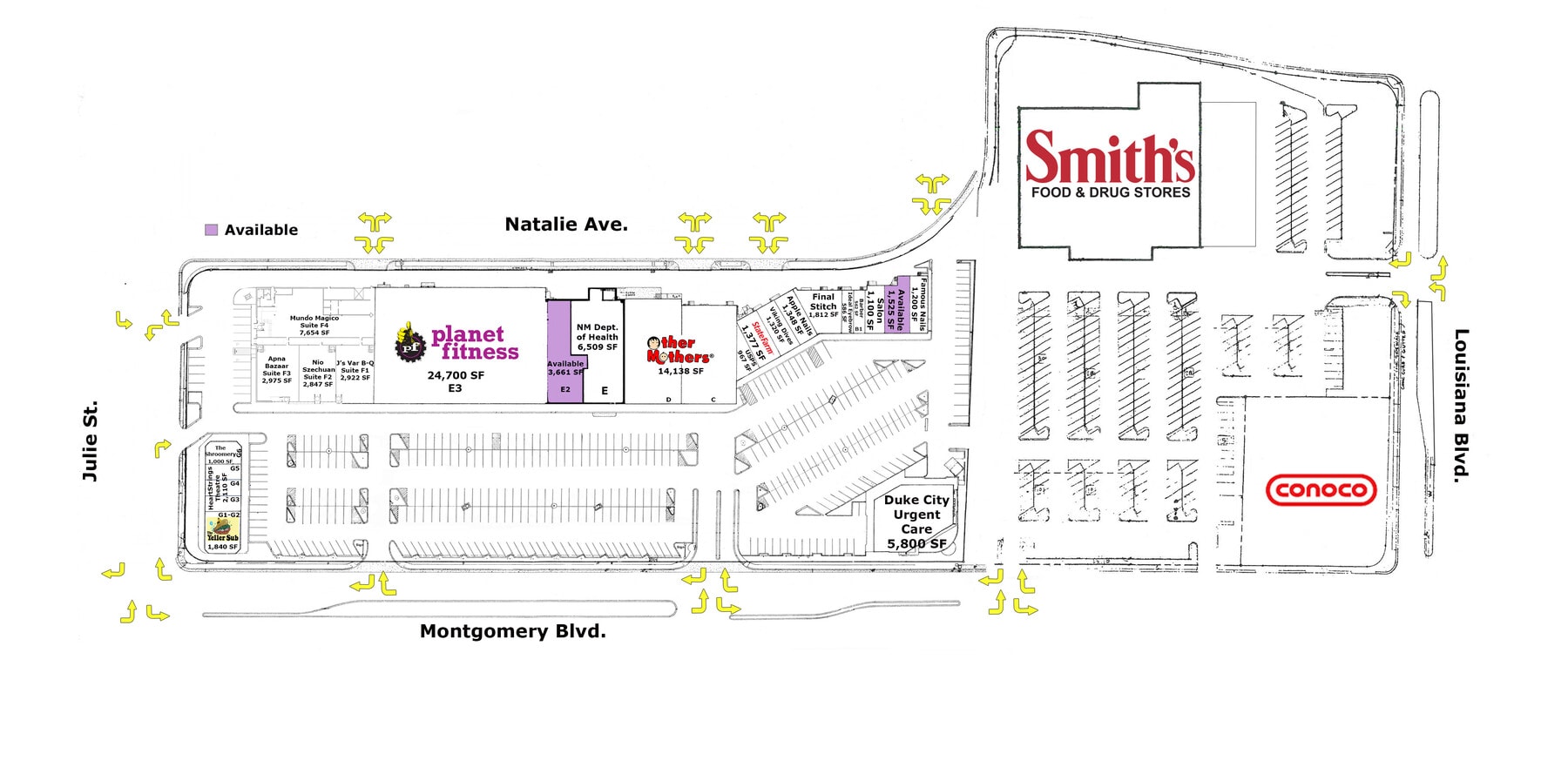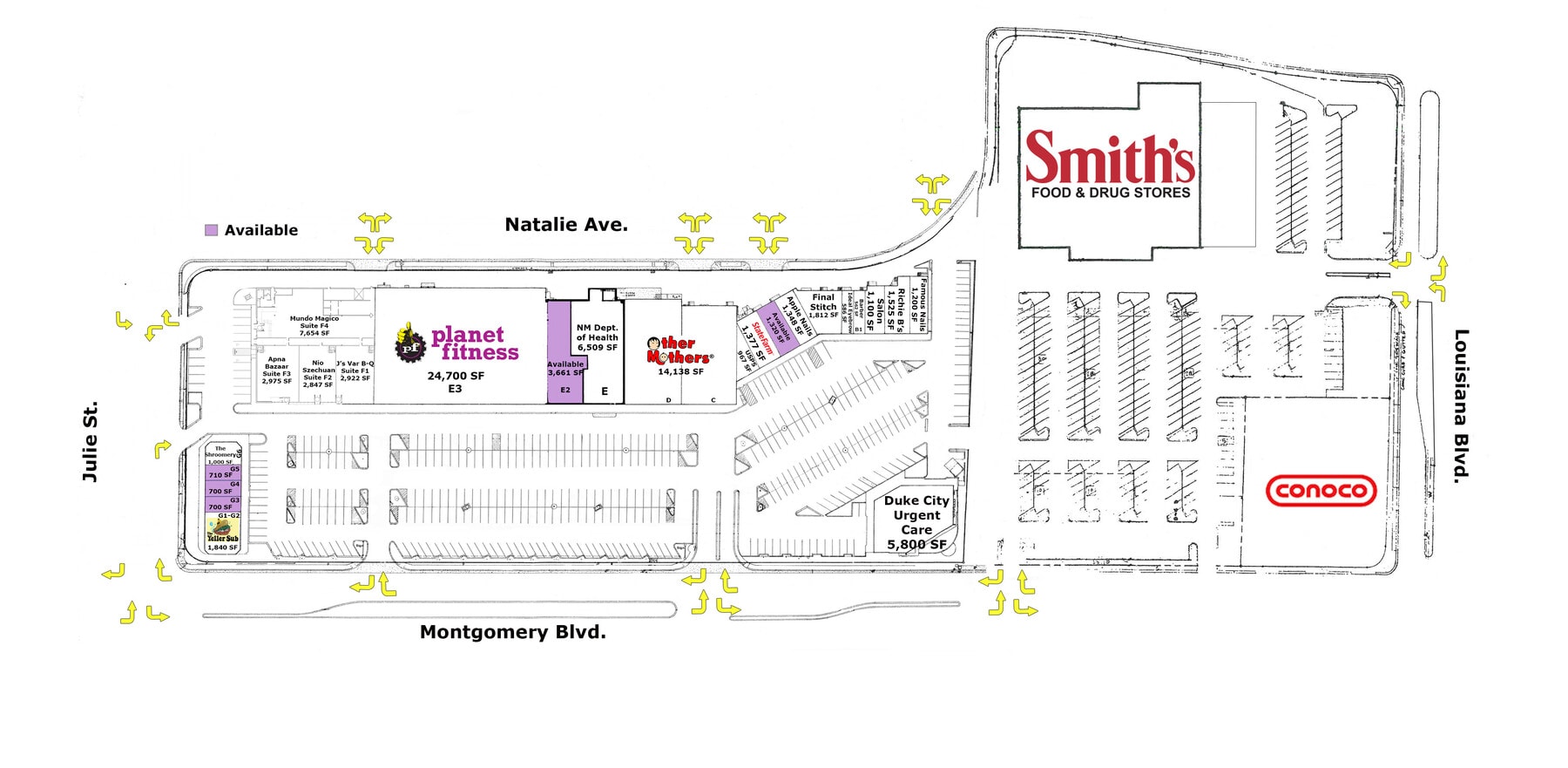 Louisiana Plaza has been the most successful open-air shopping center in the Albuquerque heights since 1986. It features T.J. Maxx, Smiths grocery store, Weems Gallery, Petsense & Duke City Urgent Care. Plus, there is a free standing reader board along Montgomery for use by all tenants.