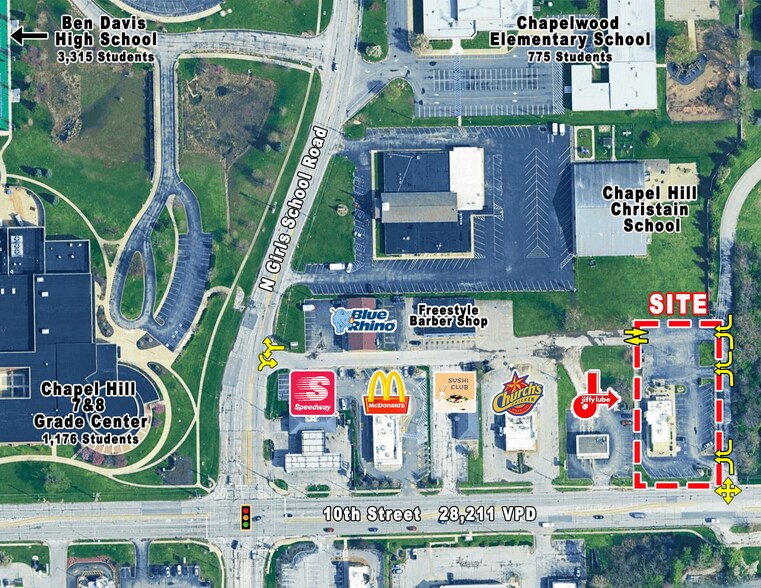 - 3,300 SF drive-thru building - Former restaurant on +/- 1.01 acres - Large pylon sign - 65 parking spaces - Located along 10th St; 28,211 cars per day - Access to N Girls School Road; 16,980 cars per day - Just a mile east of I-465 - Surrounded by 5,700+ students at Ben Davis & Covenant Christian