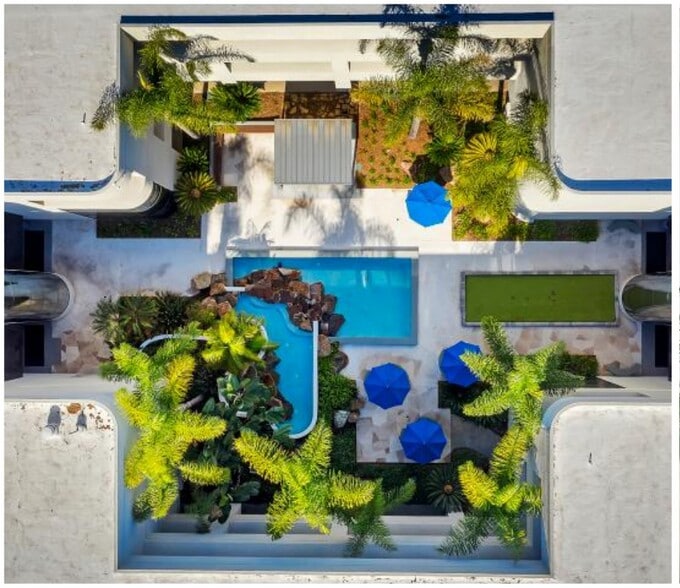 - Indoor/Outdoor central courtyard with water feature, shaded seating areas & a bocce court