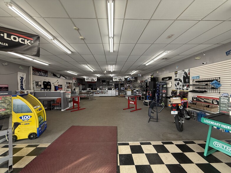 A concrete block 3600 SF retail/showroom with attached 2600 SF high bay insulated metal warehouse and adjoining two story wood frame garage with 1500 SF per floor.