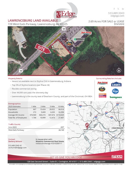 Vacant lot available next to Skyline Chili in Lawrenceburg, Indiana. Top 5% of Skyline locations (per Placer.AI). Flexible commercial zoning. Over 44,000 cars pass the site every day. Lawrenceburg is the county seat of Dearborn County, and part of the Cincinnati, OH MSA.