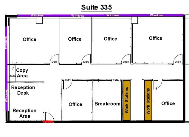 Features four private offices, three of which have windows, along with a reception desk, waiting area, storage closet, and coat storage.