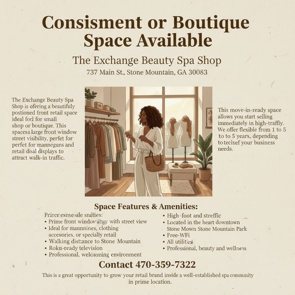 Prime Commercial Building for Lease – 737 Main Street, Stone Mountain, GA Discover the perfect space to launch or expand your business in this versatile 2,200 sq. ft. commercial building located in the heart of historic downtown Stone Mountain. Consignment or Boutique Space Available The Exchange Beauty Spa Shop 737 Main St., Stone Mountain, GA 30083 The Exchange Beauty Spa Shop is now offering a beautifully positioned front retail space ideal for a small consignment shop or boutique. This space features a large front window with street visibility, perfect for mannequins and retail displays to attract walk-in traffic. This move-in-ready space allows you to start selling immediately in a high-traffic, high-visibility area. We offer flexible lease options from 1 to 5 years, depending on your business needs. Space Features & Amenities: Prime front window display with street view Ideal for mannequins, cloting, accessories, or specialty retail High foot and street traffic Located in the heart of downtown Stone Mountain Walking distance to Stone Mountain Park Roku-ready television Free Wi-Fi All utilities included Professional, welcoming beauty and wellness environment This is a great opportunity to grow your retail brand inside a well-established beauty spa community in a prime location. This area is zone C-3 In Stone Mountain, GA, a C-3 zone refers to a General Commercial district, intended for a variety of businesses like retail, restaurants, and services, allowing for more intensive commercial development compared to neighborhood centers, but specific rules vary, so checking the City of Stone Mountain Zoning Ordinance for exact uses and development standards is crucial. Here's a breakdown of what C-3 generally means in a city context: Purpose: To accommodate a wide range of commercial activities that serve the general public and the region, generating traffic and employment. Permitted Uses: Typically includes retail stores, restaurants, offices, entertainment venues, and sometimes even light industrial or wholesale uses, depending on local regulations. Development Standards: These define building heights, setbacks (distance from property lines), parking requirements, and landscaping rules. To find the specific rules for a C-3 zone in Stone Mountain: Check the City's Zoning Map: Use the city's official map (found via Revize (https://cms4files1.revize.com/stonemountain/document_center/Zoning_Map.pdf)) to identify properties in the C-3 zone. Consult the Zoning Ordinance: Look for Chapter 18.32 (or similar) in the City of Stone Mountain Zoning Ordinance for detailed regulations on uses, dimensions, and design.