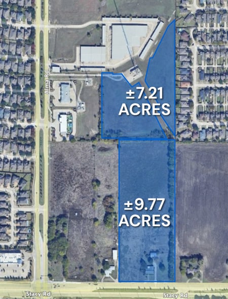 This ±16.98-acre two-tract development opportunity at 7400 Stacy Road in McKinney, Texas offers exceptional flexibility for multifamily or townhome development in one of the DFW metroplex's fastest-growing corridors. The North Tract (±7.21 AC, zoned PD 1270) and South Tract (±9.77 AC, AG/Urban Living — allowing MF and BTR) are served by City of McKinney utilities and carry one of the most competitive tax rates in North Texas at just 1.66%. The site is zoned to Frisco ISD, rated No. 7 in Texas by Niche.com, with Comstock Elementary earning a perfect 10/10 rating. Surrounding demographics are exceptional — average household incomes reach $163,184 within 5 miles, median home values exceed $540,000 within 3 miles, and 5-year population growth projections range from 14–16% across the trade area. The immediate development environment validates the opportunity on every level. Aura 3Twenty is actively delivering 630 multifamily units directly adjacent to the site, retail is under construction across the street, and major mixed-use projects including Craig Ranch (2,200 AC), The Farm (135 AC), and Monarch City (238 AC) surround the corridor. With less than 1.5 miles to the Sam Rayburn Tollway, 10 minutes to the heart of Frisco, and 30 minutes to DFW Airport, this site combines a prime location, proven absorption, and institutional-quality demographics into one of the most well-positioned development parcels available in the McKinney/Frisco submarket today.