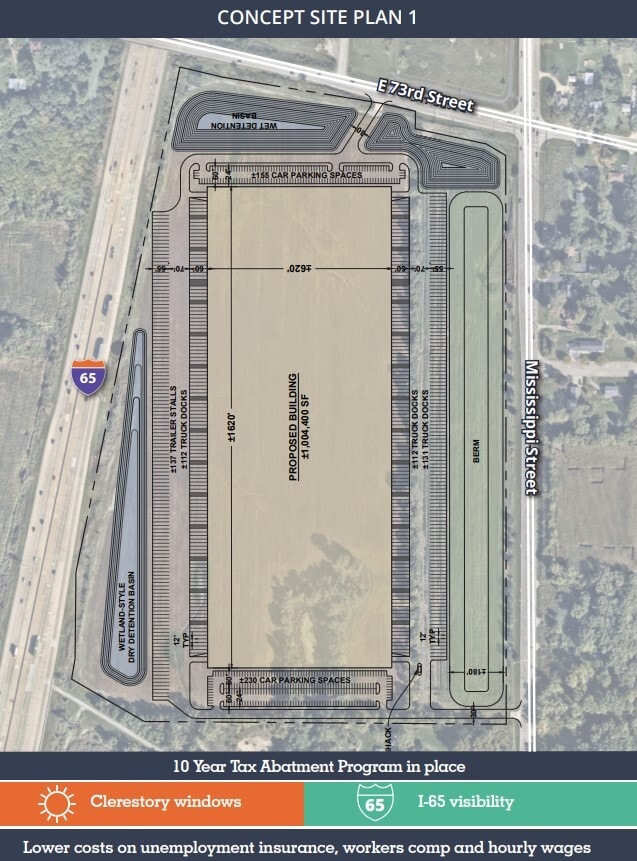 This 66 acre site with multiple build-to-suit concepts is well situated in the exploding Northwest Indiana submarket. Located only 40 miles from Chicago, this site can accommodate users from 206,102 SF to 434,254 SF. a 24.6 acre adjacent site is available for expansion. With substantial frontage along I-65 and access to multiple interstates via the 4-way interchange at US Route 30, the site offers a prime Midwest distribution location.