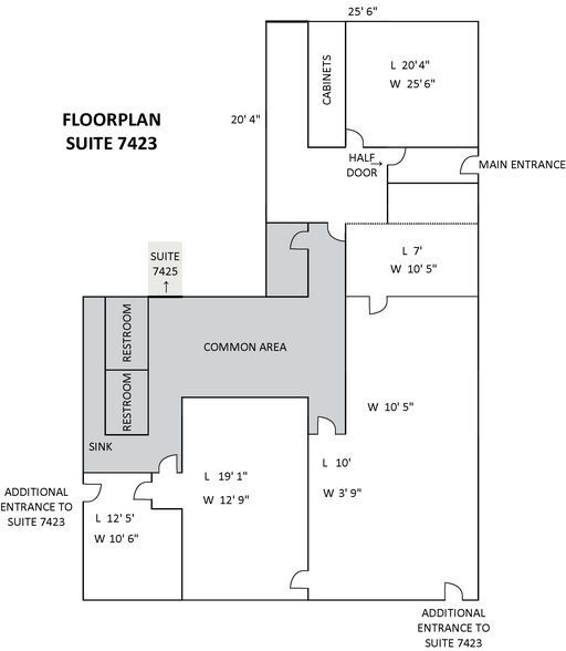 Suite 7423 is 1,310 SF with two offices, a reception area, office supply cabinets with workstations, and two large bullpen areas. Restrooms are in a shared space with each suite having a single bathroom. The building features beautiful natural light in every space, fresh paint, new carpet, and is turn-key.