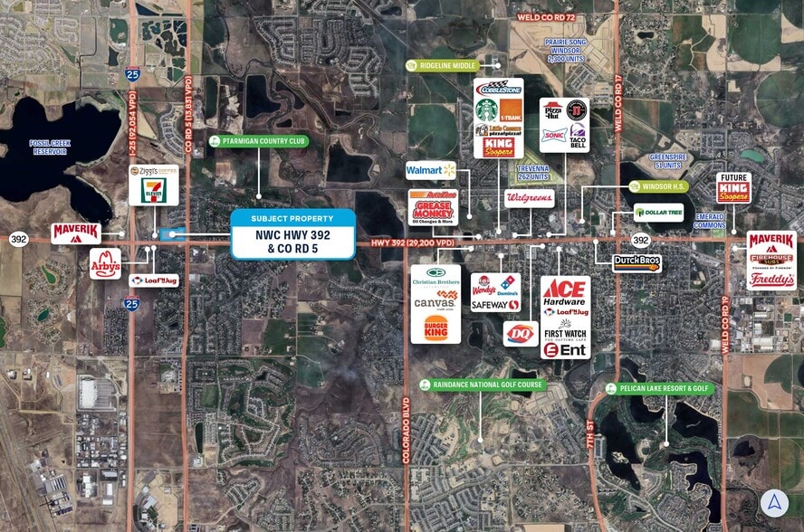 Blue West Capital is pleased to present Hwy 392 & CO Rd 5 in Windsor, Colorado, a 17.3-acre commercial land opportunity available For Sale, Build To Suit, or Ground Lease. Zoned General Commercial with flexible pad sizing, the site supports a range of retail, service, and mixed commercial development concepts. Positioned at a highly visible intersection with strong regional connectivity, this offering provides a scalable land position in one of Northern Colorado’s primary growth corridors.