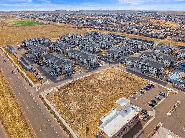 Exceptional commercial land opportunity in a rapidly expanding growth corridor between Colorado Springs and Peyton. This 1.58-acre pad site offers prime location, flexible uses, and entry to the market while it continues to grow. Perfect for a quick-service restaurant, but also presenting opportunities for developers, investors and franchisees in a variety of industries, the site offers high vehicular traffic along a major commuting corridor, growing population with strong household incomes, and ample square footage to drive income, along with ample parking. A nearly 400-unit apartment complex is adjacent to the site, and along with close proximity to Sterling Ranch, Banning Lews, Wolf Ranch and Cordera, the site is within easy access to many popular neighborhoods in the northeast corridor. Utilities are at the property line, and a centralized detention pond is already in place. Part of the MW Retail BID, everything is in place to support this vacant land as a solid generator of revenue and growth.