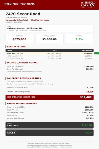 This Net investment property offers a hassle-free opportunity for investors, as the tenant, MyEyeDr, covers rent, CAM, and real estate taxes. Located at 7470 Secor Rd, Lambertville, MI, the property was built in 2006 and spans approximately 2,500 square feet, making it suitable for retail use. The monthly rent of $5,000 ensures a steady income stream.