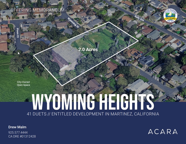 The property consists of approximately 2.0 acres of vacant land located off Wyoming Street, west of Kelly Avenue and north of Saxon Street in Martinez, California. It is entitled for 41 homes (34 duets and 7 single family) under a vesting tentative subdivision map and state density bonus waiver approvals. The site is zoned Community Services District (CSO) and is currently improved with an older building that requires demolition. Utilities are available from the City of Martinez and PG&E. The property is within the Mountain View neighborhood and the Martinez Unified School District, with nearby access to Interstate 680, Highway 4, and the Amtrak Capitol Corridor. Surrounding uses include single-family residential neighborhoods, retail centers, and public parks.