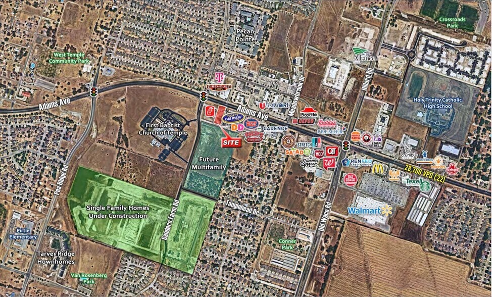 Shovel-ready retail pad site at the new four-way lighted intersection of West Adams Avenue (FM 2305) at Sanders Farm Road and Meadow Lark Drive. Shared right-in/right-out curb-cut between this Lot 2 and adjacent Lot 3. Shared cross-access drives and detention are in place. Newly opened Chick-fil-a on adjacent Lot 1. Lot 3 is a Today's Car Wash and Lot 4 is a Dunkin Donuts. 290-unit multi-family planned on 14 acres behind the pad site. Sanders Farm Road has been extended south to Travier Drive providing access to neighborhoods and schools. Restricted against restaurants serving primarily coffee, donuts or chicken.