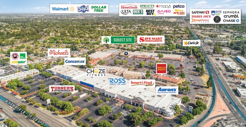 The site is located within the high-traffic Hammer Ranch retail corridor, just off West Hammer Lane (±39,188 VPD) and Pacific Avenue (±20,217 VPD). It sits among national tenants including Save Mart, Walgreens, McDonald’s, Skechers, Starbucks, and Michaels, and draws daily traffic from San Joaquin Delta College (18,610+ students) and the nearby Weberstown Mall (4.6M annual visits).