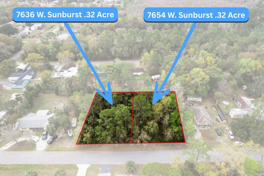 Two buildable lots for the price of one, with the option to purchase the adjoining .32-acre parcel to the east (7636 W. Sunburst), creating the potential for four buildable lots for the price of two. Rare opportunity for builders, investors, or anyone looking to secure multiple adjoining homesites in a growing area. This .32-acre subdividable homesite sits on a paved public road in an established non-HOA neighborhood, just minutes from shopping, dining, recreation, and medical services. Convenient access to US-19 and W. Homosassa Trail places the property just minutes from Old Homosassa, Homosassa Springs Wildlife State Park, Ozello, Crystal River, and Lecanto. The property is also near the Cardinal Street Suncoast Parkway exit, positioning it within approximately one hour of most destinations throughout the Tampa Bay region. MDR MH zoning permits either a single-family residence or manufactured home, offering flexibility for builders, investors, or future homeowners. Approximate lot dimensions: 100 × 138.