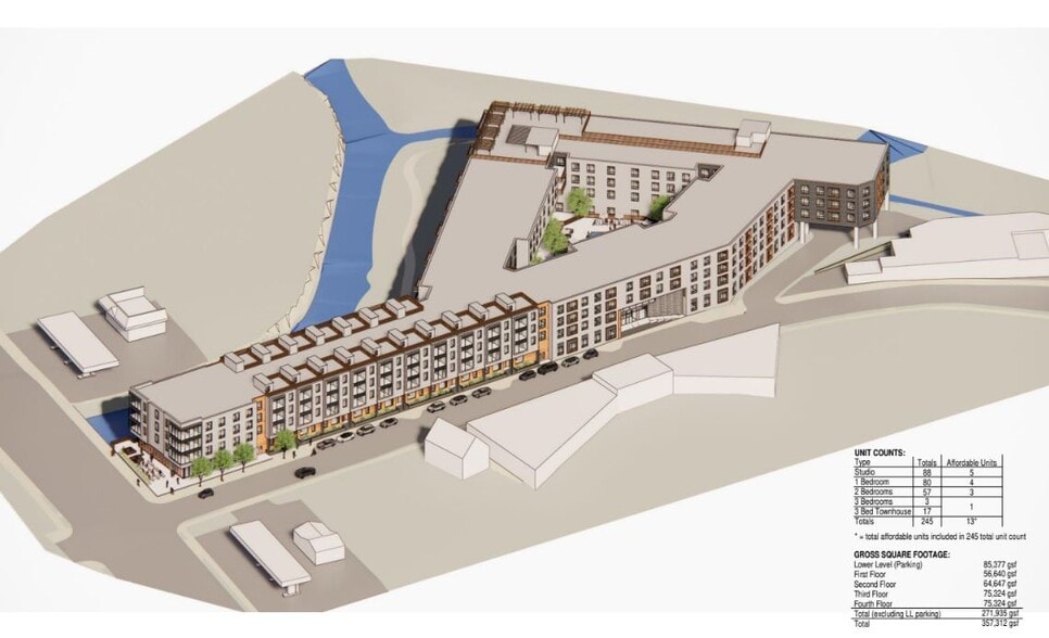 Development Project Highlights: Residential Units: 245 total units, including a mix of studio, one-bedroom, two-bedroom, and three-bedroom apartments, as well as spacious 3-bedroom townhouses. Retail and Parking: 2,300 square feet of retail space, 219 parking spaces (including a garage), and 74 bicycle spaces.