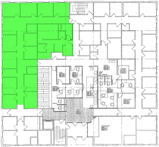 - Breakdown of space: 9 exam rooms, 3 bathrooms, 1 nurses’ station, 3 administrative offices