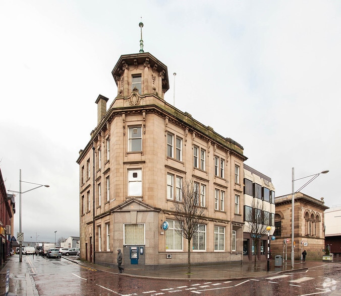 An imposing three-storey office building which has most recently operated as a Barclays Bank. The building is made up of two parts, with a traditional stone building and a more modern concrete framed structure extension. Internally, the building provides an open plan ground floor banking hall with private offices. The first and second floors provide a mixture of open plan offices, meeting rooms and a staff amenity/break-out area with kitchen and WC facilities. There is a basement with a strong room and archive file storage facilities. Heating is from a ducted gas hot water system supported by air-conditioning units.