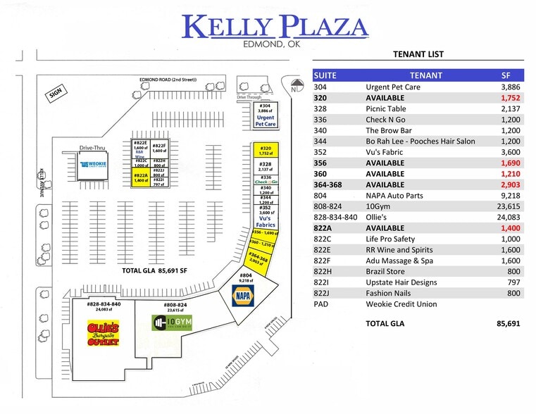 Introducing a prime retail leasing opportunity at 800-828 W Edmond Rd, Edmond, OK. This property boasts high traffic and excellent visibility on a bustling retail corridor, making it a regional draw in a location with strong demographics. Its retail and service-oriented cotenants enhance its appeal, providing the perfect environment for businesses to thrive. The Landlord is currently offering FREE RENT by giving one (1) month of Free Rent per Lease Year on all new leases.