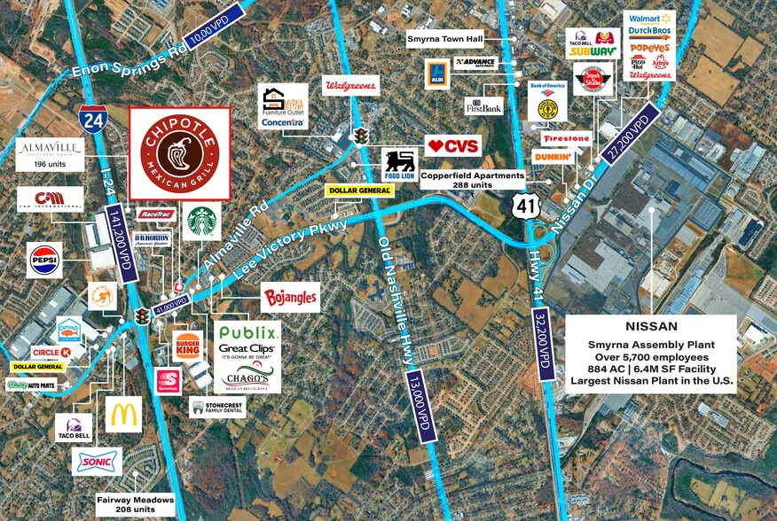 The subject property is a newly constructed Chipotle drive-thru located in Smyrna, TN. It is positioned in front of a busy Publix within a high-traffic retail corridor. The 15-year absolute NNN lease is corporately guaranteed by Chipotle Mexican Grill, Inc. (NYSE: CMG) and includes 10% rental increases every 5 years in the primary term and in the (4) five-year option periods. The property sits at the signalized intersection of Lee Victory Parkway and Almaville Road, with combined traffic counts of approximately 41,000 vehicles per day. It is also just minutes from the largest Nissan manufacturing plant in the United States, employing over 5,700 people.
