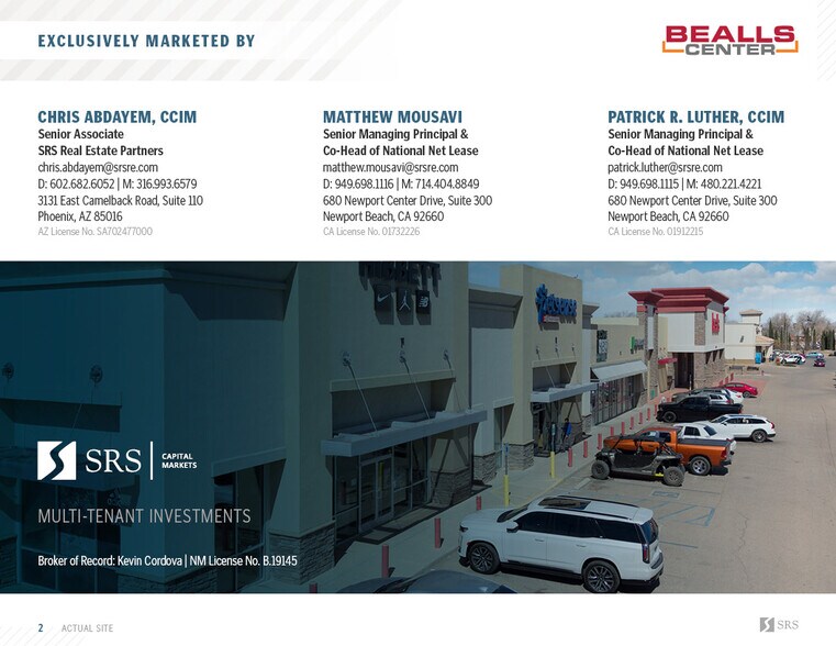 SRS Multi-Tenant Investments is pleased to offer the opportunity to acquire the fee simple interest (land & building ownership) in Bealls Center, a 40,100 SF Bealls-/Burkes-anchored neighborhood shopping center located at 805 N White Sands Blvd in Alamogordo, New Mexico. The property is 98% leased with a 3.8-year weighted average term remaining per the provided rent roll. The current tenant roster includes a mix of national/regional and service-oriented users such as Bealls, Pet Sense, Hibbett Sporting Goods, H&R Block, and additional locally oriented small-shop tenants. Five of the seven tenants have remaining renewal options, and multiple tenants are currently in renewal option periods, supporting durable in-place cash flow with embedded long term income stability.