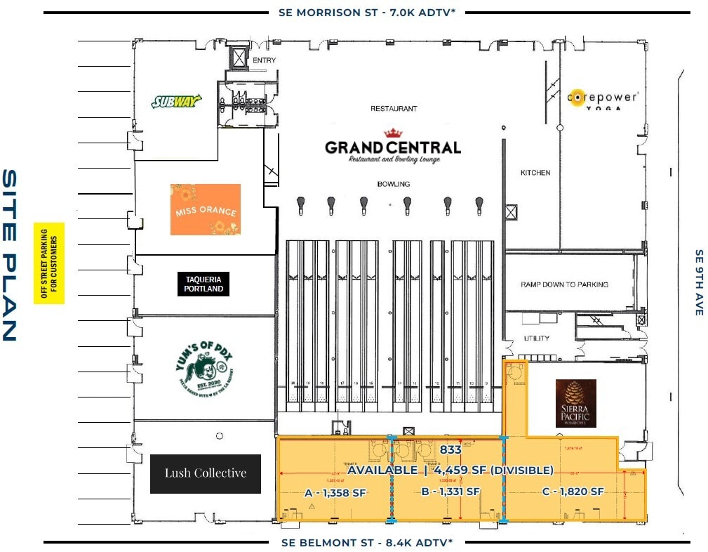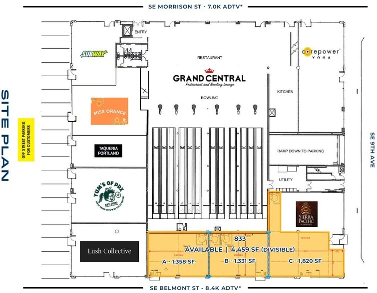 2nd-Generation Restaurant / Retail / Service and Office Space in Buckman Neighborhood -------------------- Office Space: ±3,050 SF (Mezzanine Level) Lease Rate: $25 psf NNN Available Now Retail Suite 833: 1,331 - 4,459 SF (Street Level) Lease Rate: $27 psf NNN Available 30 Day Notice -------------------- Property Features: • 2nd Generation Restaurant / Retail / Service and Office Space • Customer Parking Options include On-street, Off-street, and a Large Parking Garage. • Parking Ratio 1.96 / 1,000 SF • Co-tenants include Grand Central Bowl & Arcade, Subway, Taqueria Portland, CorePower Yoga, and Lush Collective Salon, Yum’s PDX Pizza, WELCOME MISS ORANGE! -------------------- Location Features: • Adjacent to the Goat Blocks (247 Unit Apartments) • Located in the “Walkable” SE Neighborhood of Buckman with nearby Transit including Portland Streetcar and TriMet Bus Lines 6, 12, 19, 20, and 70. • Nearby Inner Eastside Highlights: Afuri, Bao Bao, Olympia Provisions, Dos Hermanos Bakery, Market of Choice, Kachka, Cascade Brewing Barrel House, Hopscotch, Portland Coffee Roasters, Ironside Training and more.