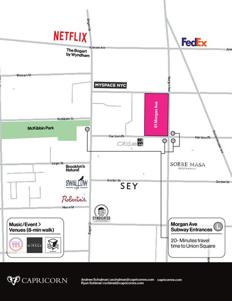 HIGHLIGHTS: • Prime space in Brooklyn's creative Bushwick neighborhood for Anchor and Jr. Anchor tenants including Pharmacy's, Beauty Stores, Grocery Stores, Hardware Stores, Paint Stores, Restaurants, Cafes, Deli's etc. • One 1,200 SF Space and a 2nd one with up to +/-6,883 SF Available (divisible). • Ground-Up development one block from Netflix’s new 165k SF campus studios. • Sandwiched between two Morgan Ave Subway entrances (L Train), providing convenient access to Downtown Brooklyn and Union Square in Manhattan. • Located between two Morgan Ave Subway entrances (L Train), providing convenient access to Downtown Brooklyn and Union Square in Manhattan. • Surrounded by many eateries and new real estate developments, including Roberta's, Otis, Sey Coffee, Swallow Cafe, Syndicated Bar Theater Kitchen, Brooklyn's Natural, Friends NYC, and many others.