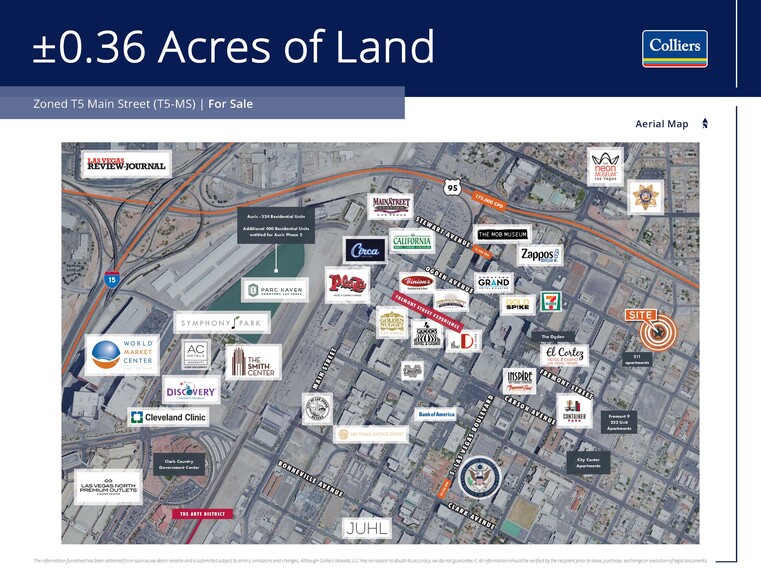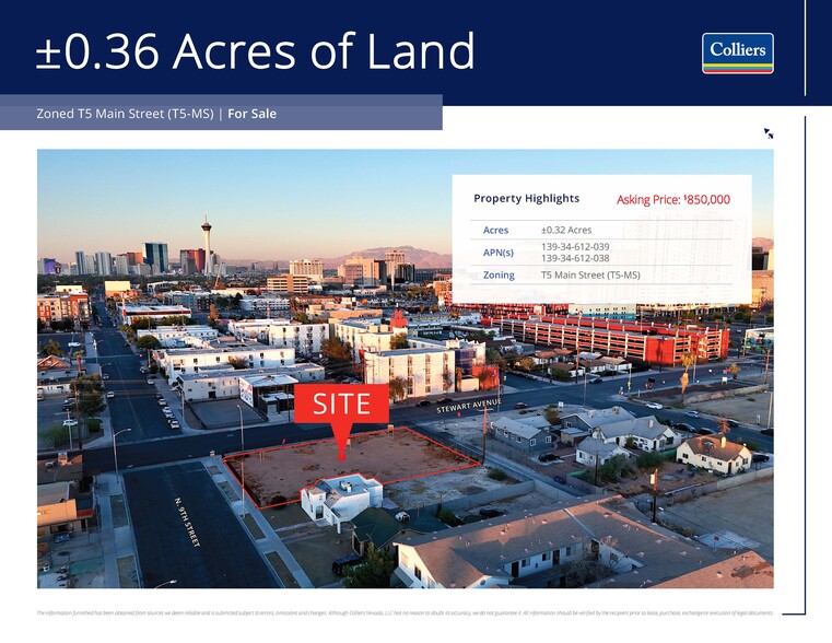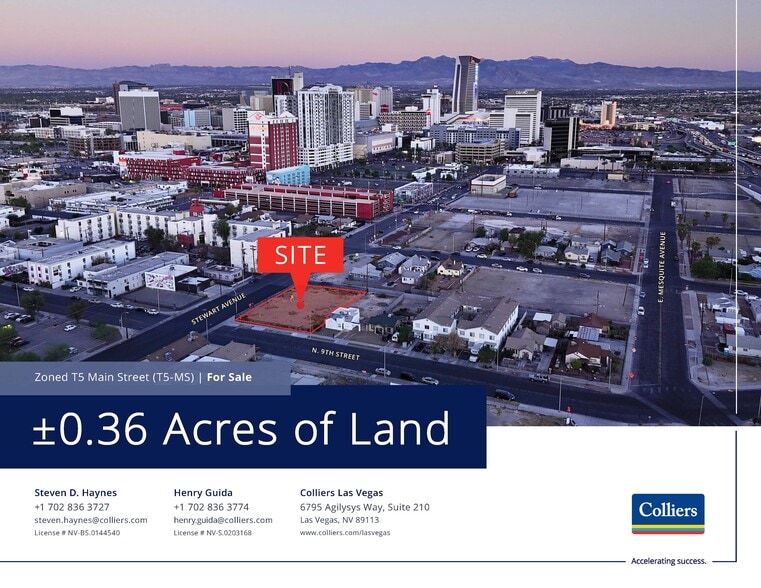 Colliers is pleased to present an exceptional opportunity to acquire a ±0.36 acre zoned T5 Main Street (T5-MS) in the Historic Downtown Las Vegas which allows for great flexibility for design and construction. The development is comprised of two contiguous parcels: 812 Stewart Avenue & 307 N. 9th Street, which is located at the NW corner of 9th Street and Stewart Avenue. The site can be easily accessed by two major Freeways, (U.S. 95 & I-15) along with S. Las Vegas Boulevard.