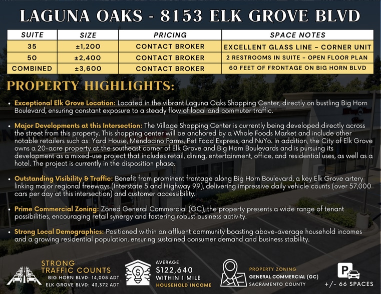 Retail Space in the Heart of Elk Grove’s Growth Corridor Discover flexible ±1,200–3,600 SF retail opportunities at Laguna Oaks, a high-visibility center located at the high-traffic intersection of Elk Grove Blvd and Big Horn Blvd. With exceptional exposure to over 57,000 cars daily, this center sits at the gateway to Elk Grove’s dynamic retail and residential expansion. Laguna Oaks is surrounded by national retailers, high-income neighborhoods, and major public-private developments, including a new Whole Foods-anchored center and a city-led mixed-use project just steps away. Whether you're looking to establish a new concept or expand in one of the region's fastest-growing markets, this location offers standout potential and unmatched convenience.